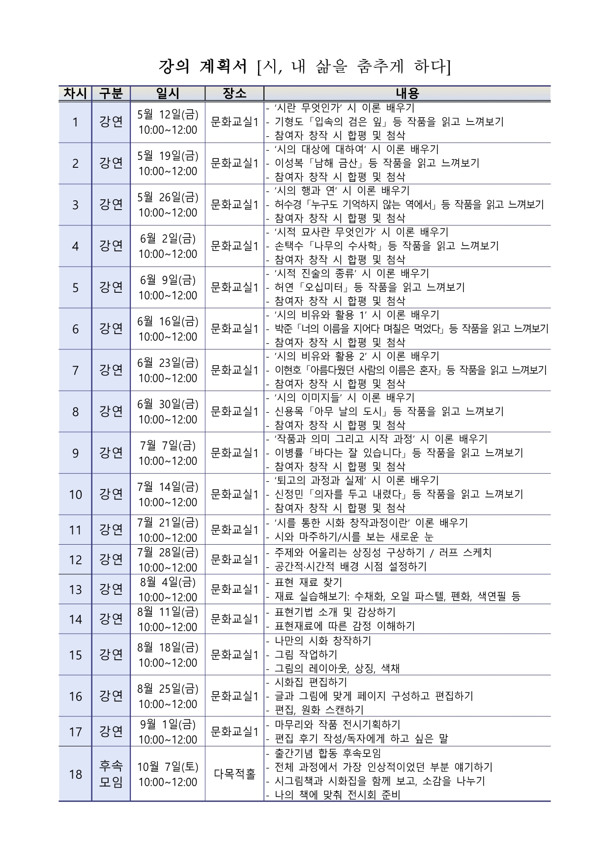| 첨부파일 | 강의 계획서 [시, 내 삶을 춤추게 하다].jpg |