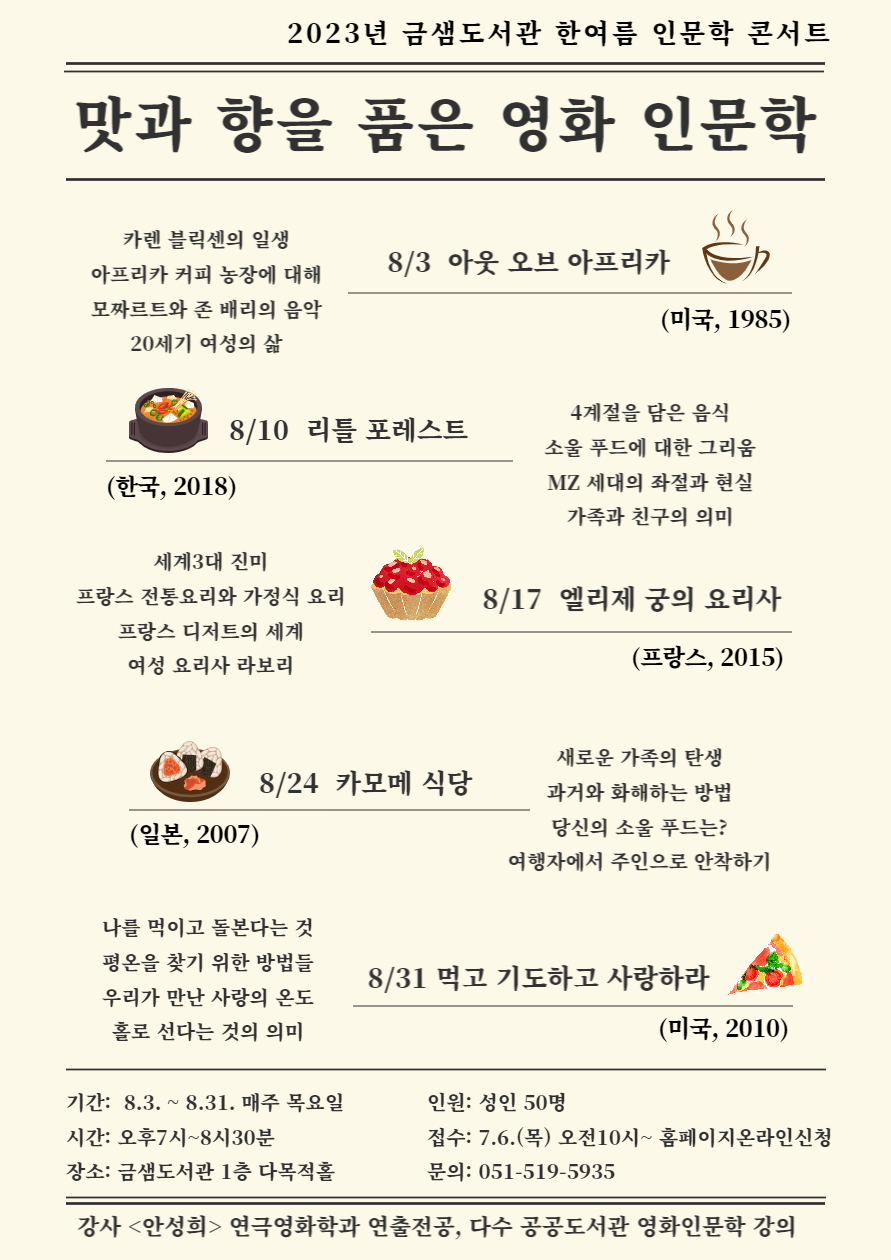 | 금샘도서관 한여름 인문학 콘서트 <맛과 향을 품은 영화 인문학> 야간 인문 강좌 | |