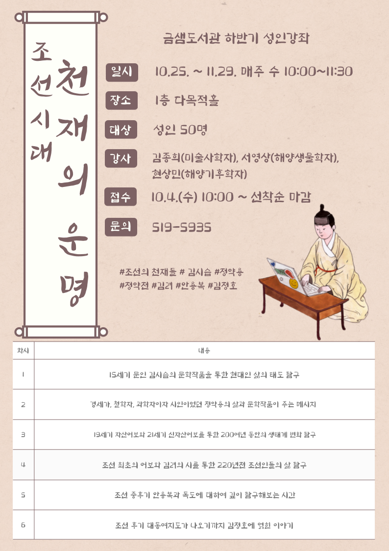 | [금샘도서관 하반기 성인강좌] 조선시대, 천재의 운명 | |