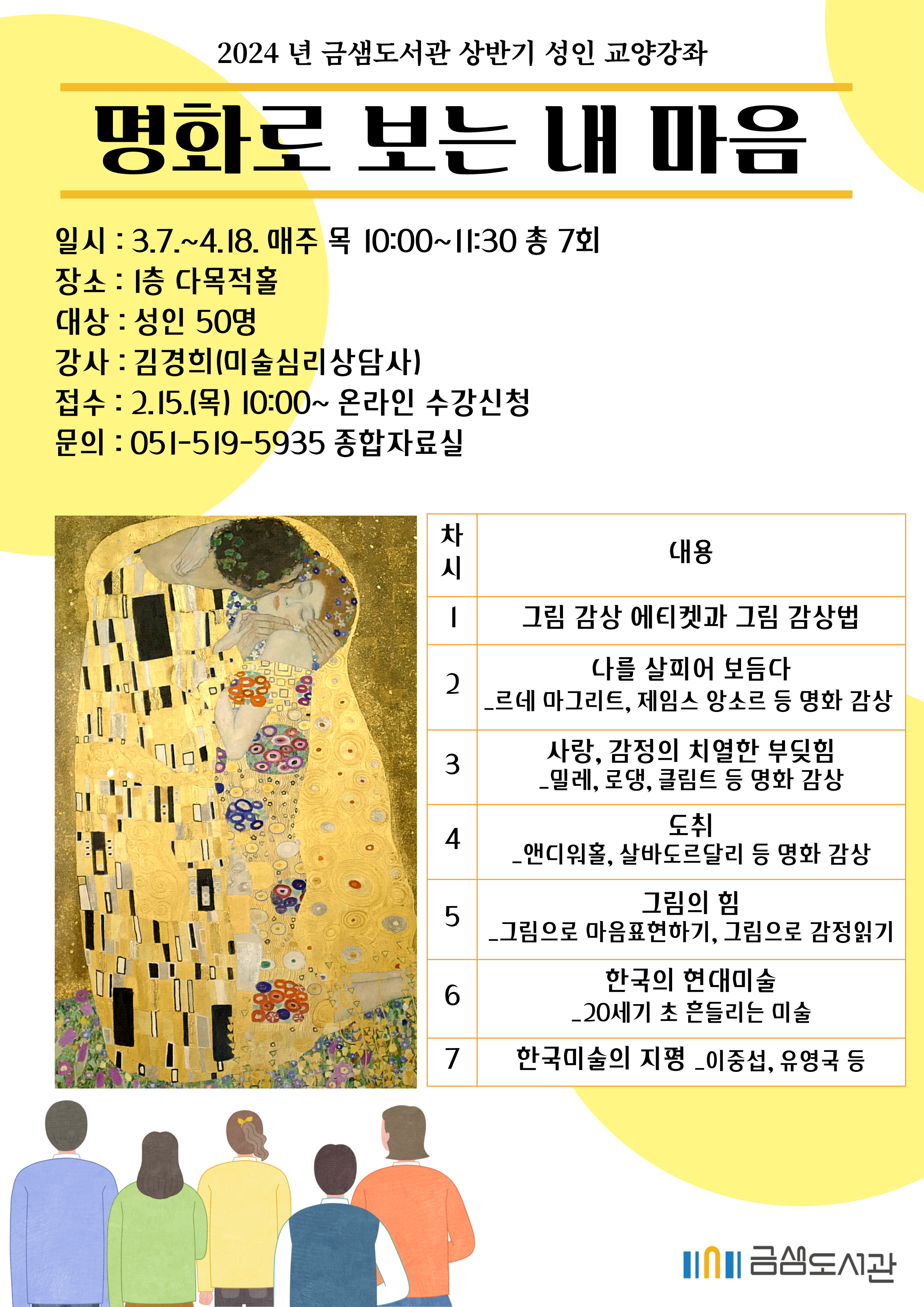 | 강좌명 : 명화로 보는 내 마음 일시 : 3.7.~4.18. 매주 목 10:00~11:30 총 7회 장소 : 1층 다목적홀 대상 : 성인 50명 강사 : 김경희(미술심리상담사) 접수 : 2.15.(목) 10:00~ 온라인 수강신청 문의 : 051-519-5935 종합자료실 ![]() |
