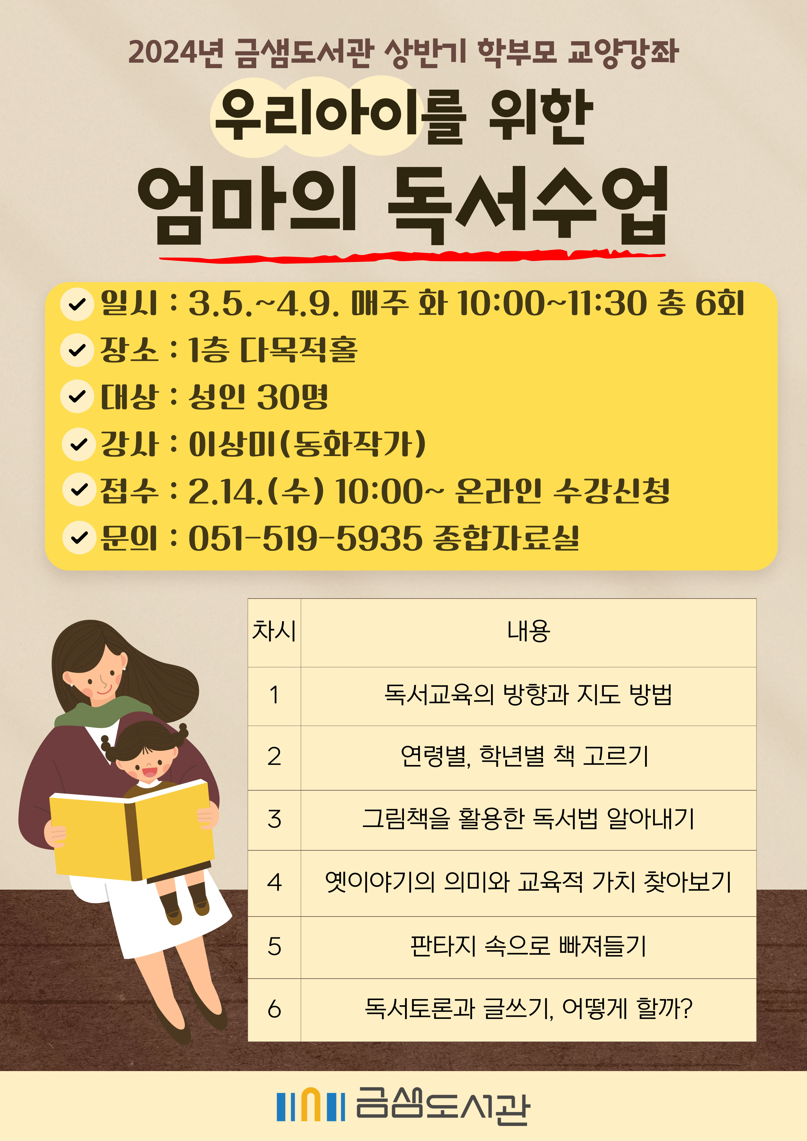 | 강좌명 : 우리아이를 위한 엄마의 독서 수업 일시 : 3.5.~4.9. 매주 화 10:00~11:30 총 6회 장소 : 1층 다목적홀 대상 : 성인 30명 강사 : 이상미(동화작가) 접수 : 2.14.(수) 10:00~온라인 수강신청 문의 : 051-519-5935 종합자료실 ![]() |