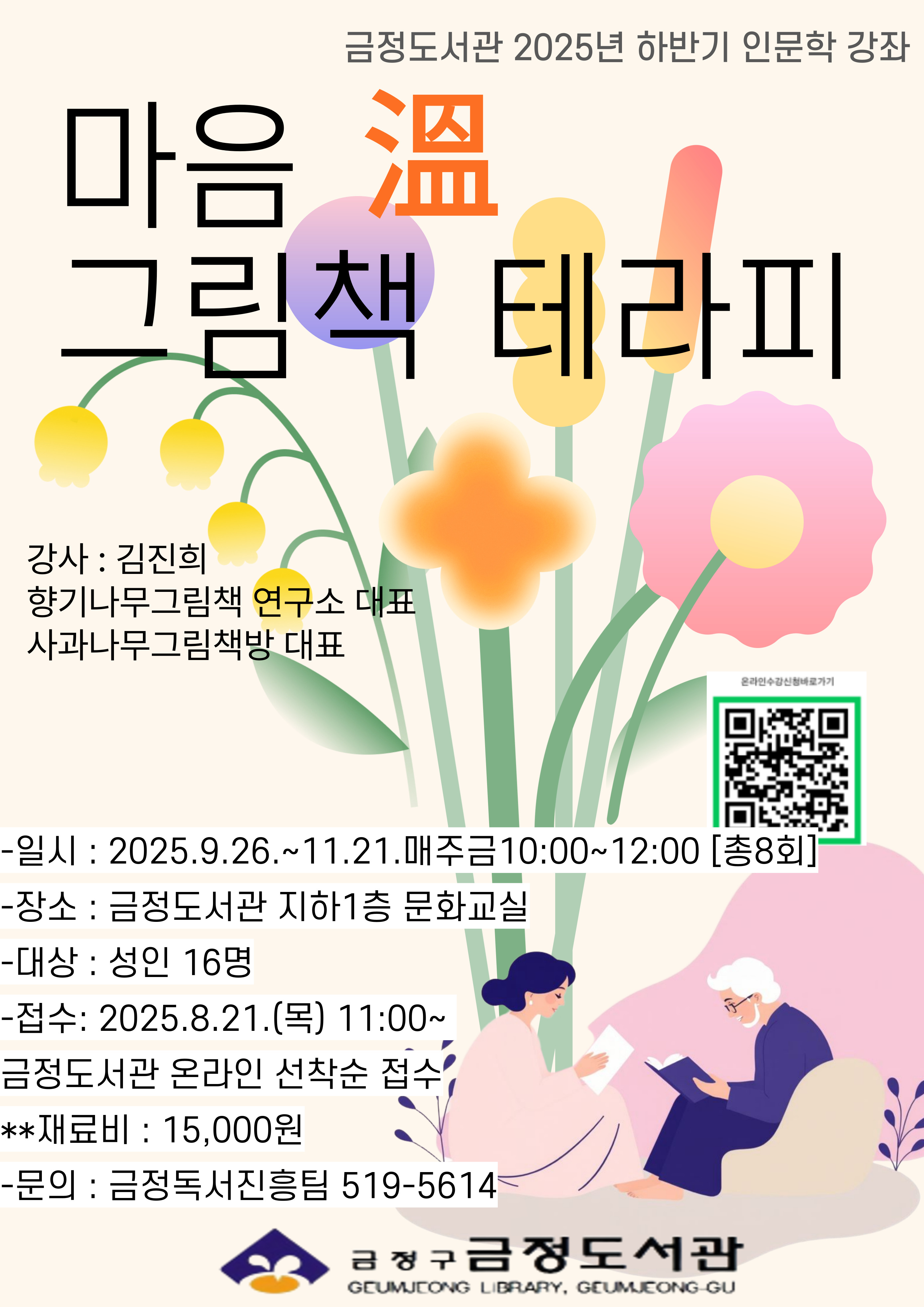 -강의 일시 : 2025.10.17. ~ 11.21. 총 6차시 남음 -강의내용 : 그림책으로 여는 어른들의 마음쉼터, 그림책의 마음 치유 효과와 예술적 가치를 알 수 있다. -강의 장소 : 금정도서관 2층 배움터 -재료비 : 15,000원(꽃바구니, 백드롭페인티 2가지) -신청 시 유의 사항 *추가 접수중입니다. 10월 17일 부터 매주 금 오전 10시 ~ 12시 진행합니다.* *교육일정을 꼭 확인하시고 해당일정에 참여 가능한지 확인 후 신청바랍니다. *개강전 수강확정문자를 보내드립니다. 문자를 받지 못하신 분은 대기자 입니다. *수업관련 모든 사항은 기재하신 휴대전화번호를 통해 안내되며, 연락불가(부재중, 문자미확인, 수신거부 등)로 인한 불이익의 책임은 본인에게 있습니다. -강의 중 촬영 안내 *홍보 및 기록용 사진/영상 촬영이 있으며 신청하신 분은 촬영에 동의하신 것으로 간주됩니다. -문의 : 051-519-5614 |