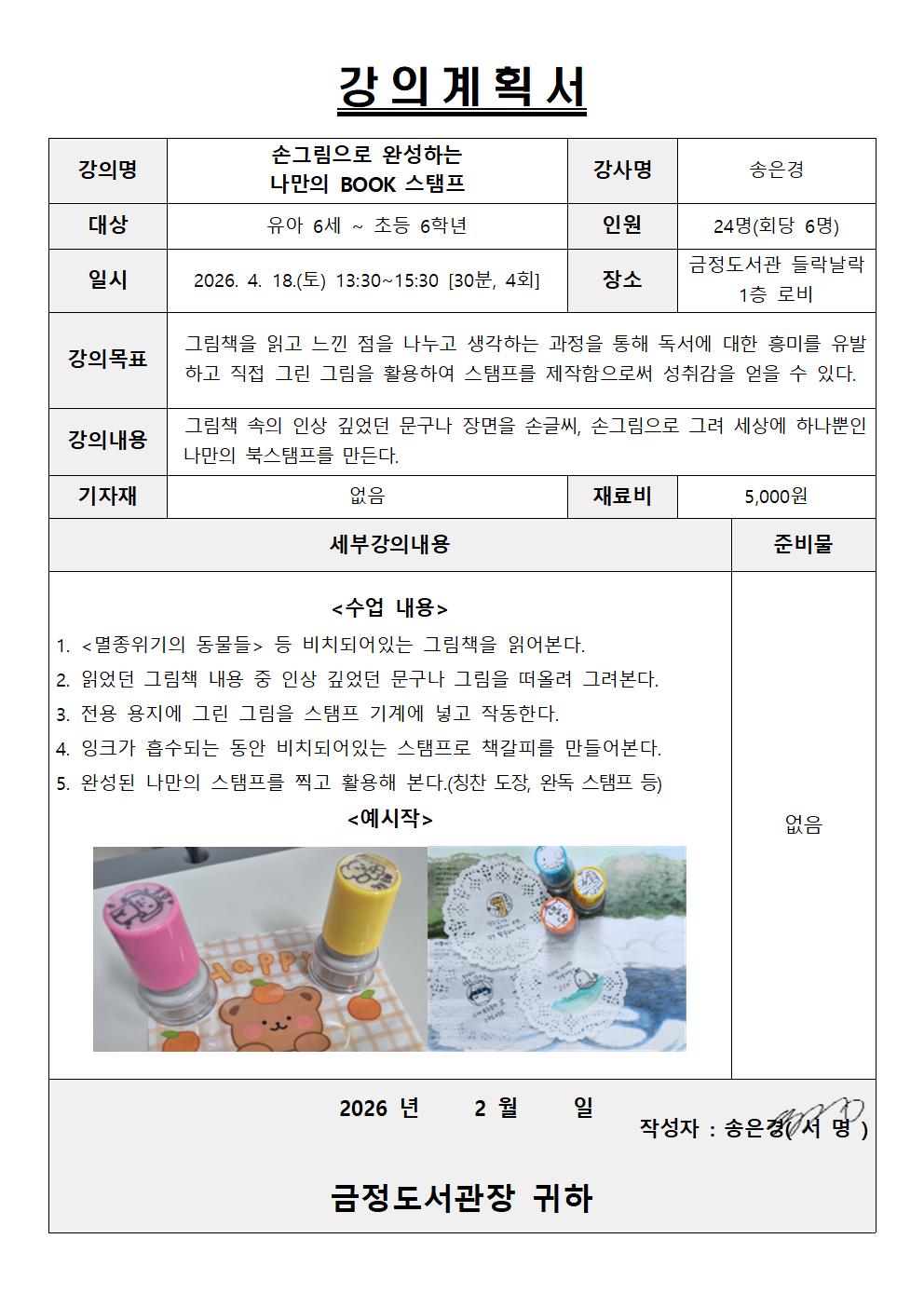 | [도서관주간] ④손그림으로 완성하는 나만의 BOOK 스탬프 만들기 체험(15:00~15:30) | |